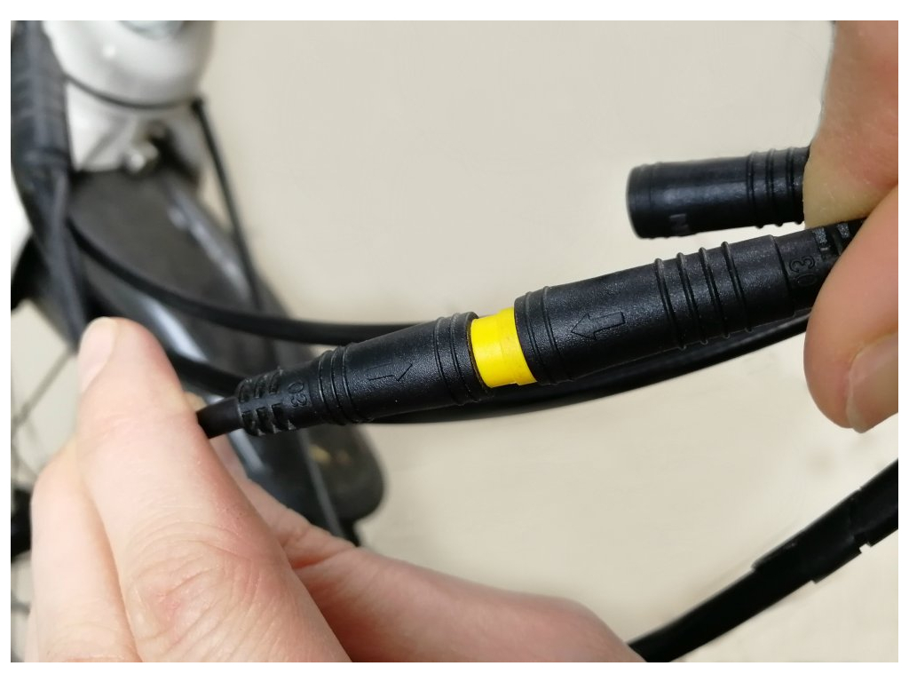 Akcelerační páčka se připojuje do hlavního kabelového svazku, který je součástí balení každého středového pohonu EVBIKE. Při zapojení akcelerační páčky se řiďte šipkami. Ty musí vždy směřovat proti sobě.